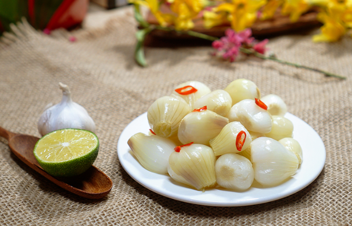 El dưa hành, o cebolla encurtida al estilo vietnamita, es un acompañamiento tradicional del Tet que aporta un sabor ácido y refrescante a la mesa festiva. Estas cebollitas blancas se fermentan ligeramente en una mezcla de vinagre, sal y azúcar, creando un equilibrio perfecto para contrarrestar la riqueza de otros platos como el nem rán o el thịt kho trứng. Aunque su sabor es intenso, muchos viajeros se sorprenden al descubrir lo bien que se armoniza con la cocina vietnamita, convirtiéndo en una experiencia gastronómica curiosa y auténtica durante el Año Nuevo.