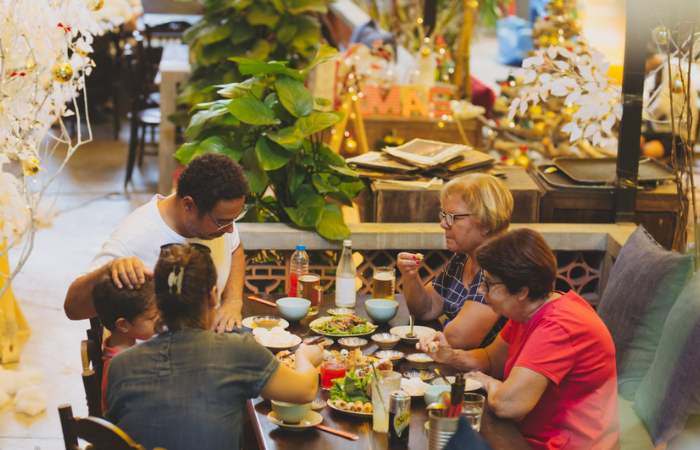La cena de Nochevieja es uno de los momentos más importantes del año. Las familias se reúnen para compartir una comida abundante con platos típicos como bánh chưng, thịt kho trứng, rollitos de primavera fritos (nem rán) y sopa de bambú (canh măng). Es una celebración de unión, gratitud y esperanza para el año nuevo. Algunos anfitriones incluso reciben a viajeros para compartir esta tradición.
