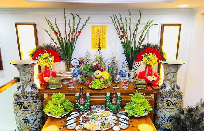 Durante el Tet, el altar se embellece con ofrendas como flores frescas, frutas, frutas confitadas (“Mứt Tết” en vietnamita), té, vino y platos tradicionales cuidadosamente preparados. En el centro destaca el bandeja de cinco frutas (“Mâm ngũ quả” en vietnamita), donde cada fruta simboliza un deseo para el nuevo año: salud, paz, fortuna, longevidad y éxito. También se colocan elementos rituales como incienso, velas, papel votivo,…
