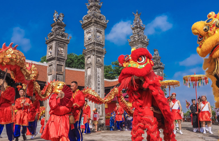 Durante los primeros días del Tet, se realizan coloridas danzas del león en calles comerciales, templos o centros culturales. Dos bailarines, cubiertos con un traje de león gigante, ejecutan movimientos acrobáticos al ritmo de tambores y platillos. Esta danza se cree que aleja la mala suerte y trae prosperidad para los negocios y hogares. - Jugar juegos tradicionales en fiestas comunitarias