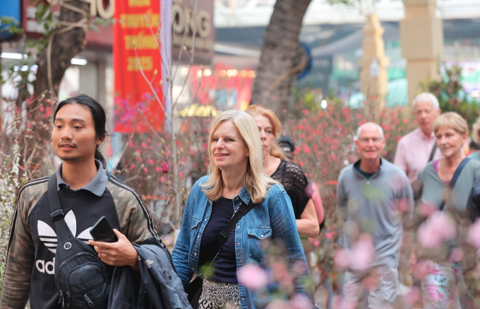 Las turistas paseando por el mercado de flores del Tet