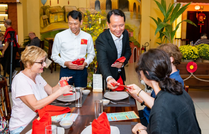 Durante el Tet, los mayores entregan a los niños y jóvenes sobres rojos llamados “lì xì” con una pequeña cantidad de dinero como símbolo de suerte. Como viajero, es posible que los anfitriones te regalen uno como muestra de bienvenida. A cambio, puedes aprender a decir “Chúc Mừng Năm Mới” (¡Feliz año nuevo!) y sonreír con gratitud.