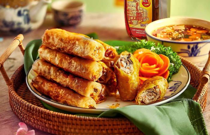 Este plato no solo es esencial en la mesa del Tet, sino que también conquista a los visitantes de todo el mundo por su sabor equilibrado y su textura crujiente. Estos rollitos fritos se preparan con papel de arroz relleno de carne de cerdo, fideos de arroz, setas y verduras, y luego se fríen hasta quedar dorados y crujientes. Servidos con salsa de pescado dulce y ligeramente picante, representan tanto el sabor casero como la hospitalidad vietnamita. Probar nem rán durante el Año Nuevo vietnamita es descubrir una parte esencial de la cultura culinaria del país.
