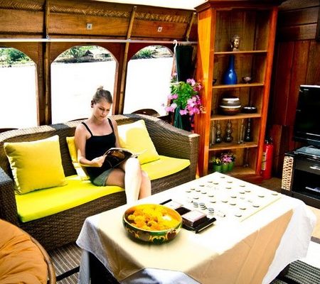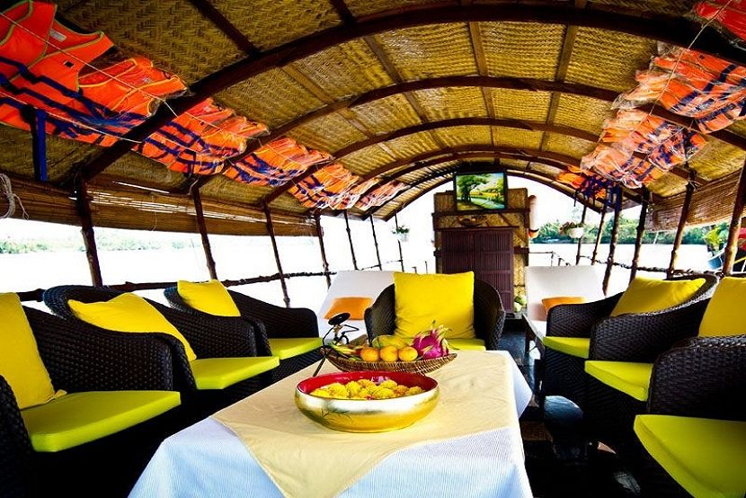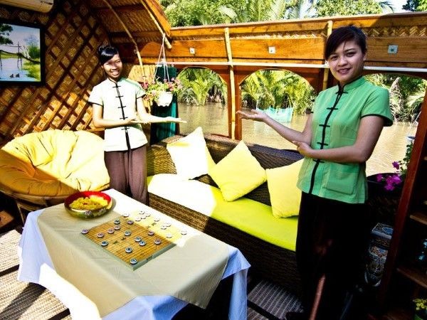 Con una longitud total de 22 metros y 4,5 metros de ancho, tradicional Crucero Mango de madera ofrece un espacio ideal y cómodo para un pequeño grupo de pasajeros de todas las edades para explorar la extraña vida en el tesoro importante de Vietnam, delta del Mekong. El sampán Mango permite el acceso a los pequeños arroyos llenas de palmeras de agua y puertos pintorescos que constituyen uno de los encantos esenciales del Delta del Mekong.