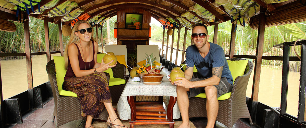 - A las 07:00 salida hacia Ben Tre, ubicado en el Delta del Mekong. Luego, paseo en “xe loi” al lugar de reunión al borde del río donde el Crucero Mango lo estará esperando. Embarque en el crucero durante 2 días para empezar su paquete de viaje en el Delta del Mekong. Durante el crucero, podrá contemplar los paisajes fascinantes a la orilla del río mientras disfrutando agua de coco fresco.