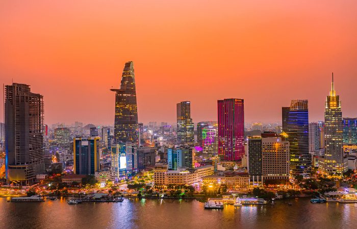 Una vibrante vista panorámica de Ciudad Ho Chi Minh al atardecer