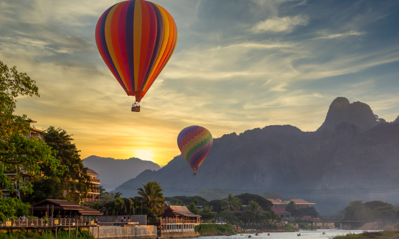 - Finalmente, llegamos a Vang Vieng, un pequeño pueblo situado en una curva del río Nam Song. Las formaciones de piedra caliza se alzan majestuosamente sobre el tranquilo río, creando un paisaje que parece sacado de una pintura tradicional asiática.